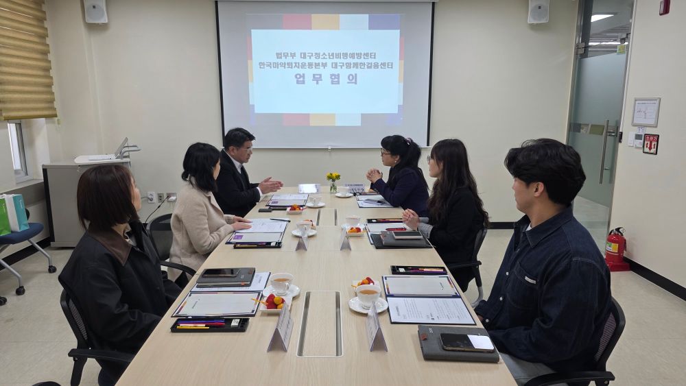 ¹ý¹«ºÎ(Àå°ü Á¤¼ºÈ£) ´ë±¸Ã»¼Ò³âºñÇ࿹¹æ¼¾ÅÍ´Â Áö³ 8ÀÏ ¿ÀÀü 10½Ã, ´ë±¸Ã»¼Ò³âºñÇ࿹¹æ¼¾ÅÍ¿¡¼ Çѱ¹¸¶¾àÅðÄ¡¿îµ¿º»ºÎ ´ë±¸ÁöºÎ¿Í ÇÔ²² û¼Ò³â Áßµ¶ ¹®Á¦ ¿¹¹æ ¹× ÀçȰ Áö¿ø °È¸¦ À§ÇÑ ¾÷¹«ÇùÀǸ¦ ½Ç½ÃÇÏ¿´´Ù.